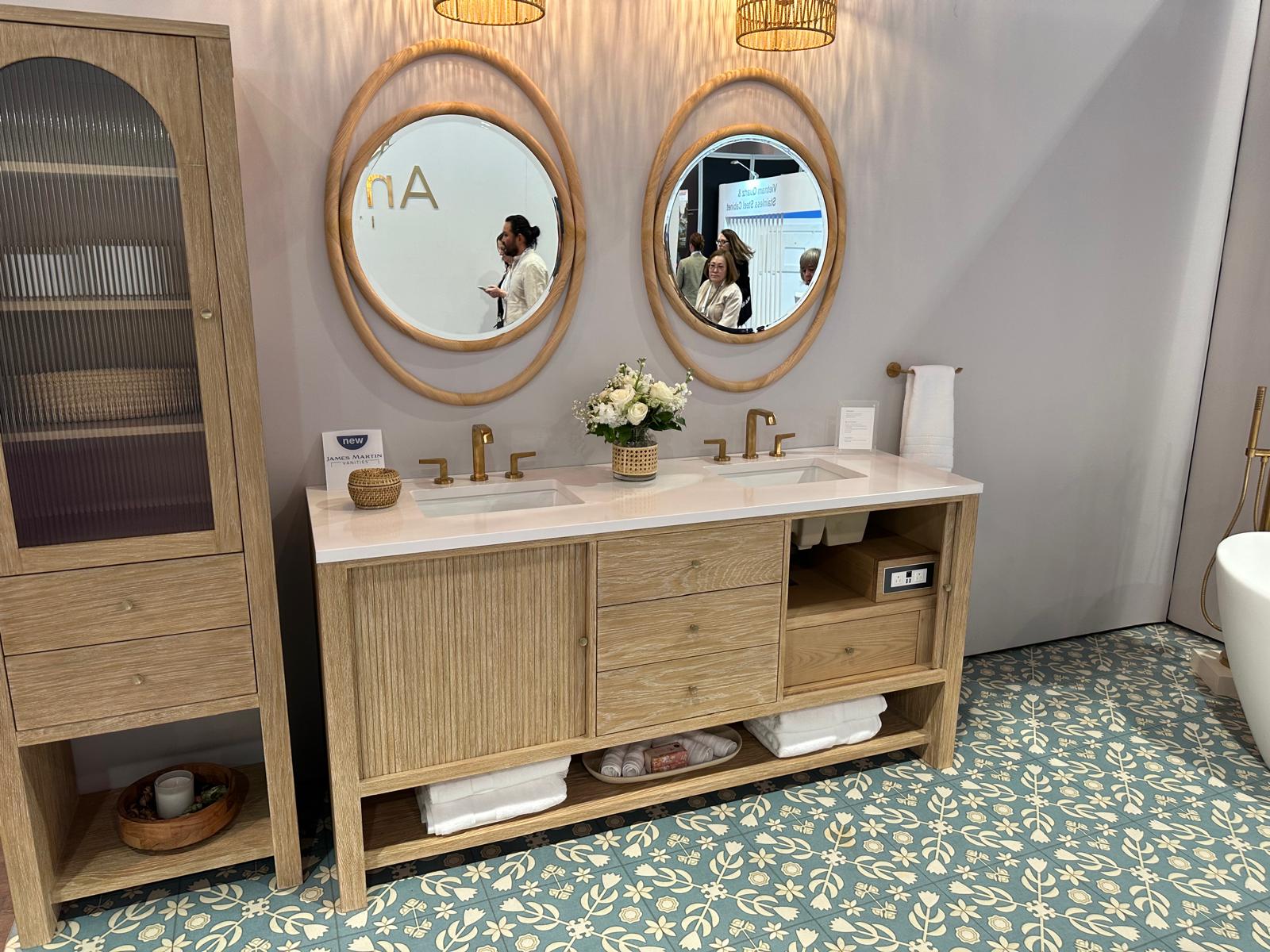 Below we feature real customer and tradeshow photos of James Martin Sunwashed Oak taken by our customers and us. Lighting, camera exposure/quality, production lots as well as your computer/tablet/phone device can vary so please call us at 888-409-2284 if you would like to know more about this cabinet finish/color and would like to receive a sample. Each photo links to the corresponding product shown in the image so you can compare it to the factory studio image and purchase it if you wish.